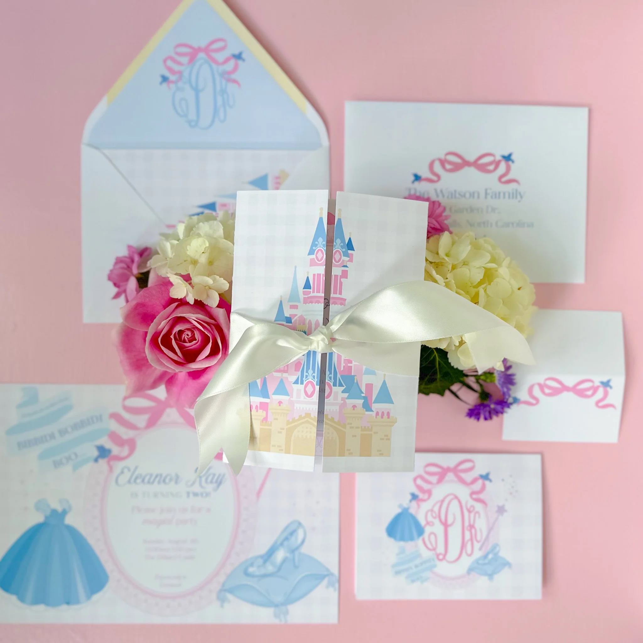 Guests were welcomed into the magic from the very beginning. The gable-style fold invitations opened like a fairytale book, with elements pulled directly from the Life Logo™ to create a castle scene. It was the perfect preview of the celebration to come.