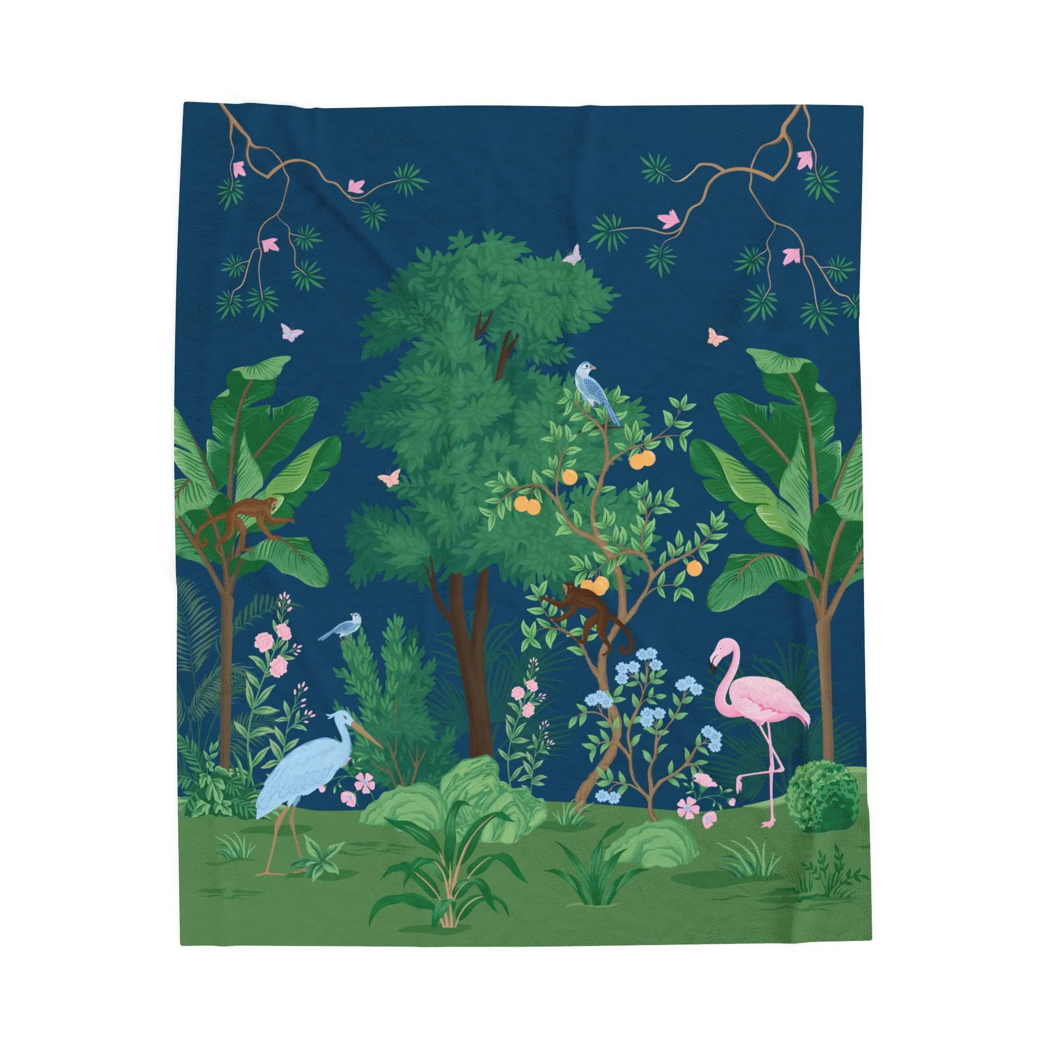 The Blue Palm Grove velveteen plush blanket features our signature Southern landscape in rich navy, layered with palms, wandering herons, citrus trees, soft florals, and playful hidden details. Designed as a permanent Hattie Hill print, this storybook-inspired scene brings warmth and depth to guest rooms, nurseries, and porch-side lounging alike.